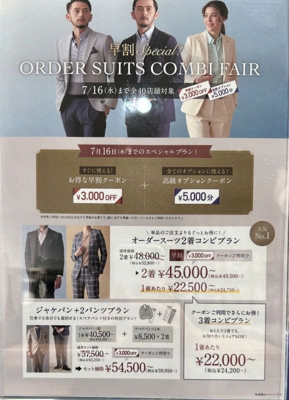 ただし、期間が7月16日までと短い期間での開催となる為、是非このお得な機会にオーダースーツをご検討してみてはいかがでしょうか!