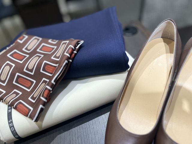 そしてパンプスはブラウン、それに合わせてブラウンのスカーフをプラス。