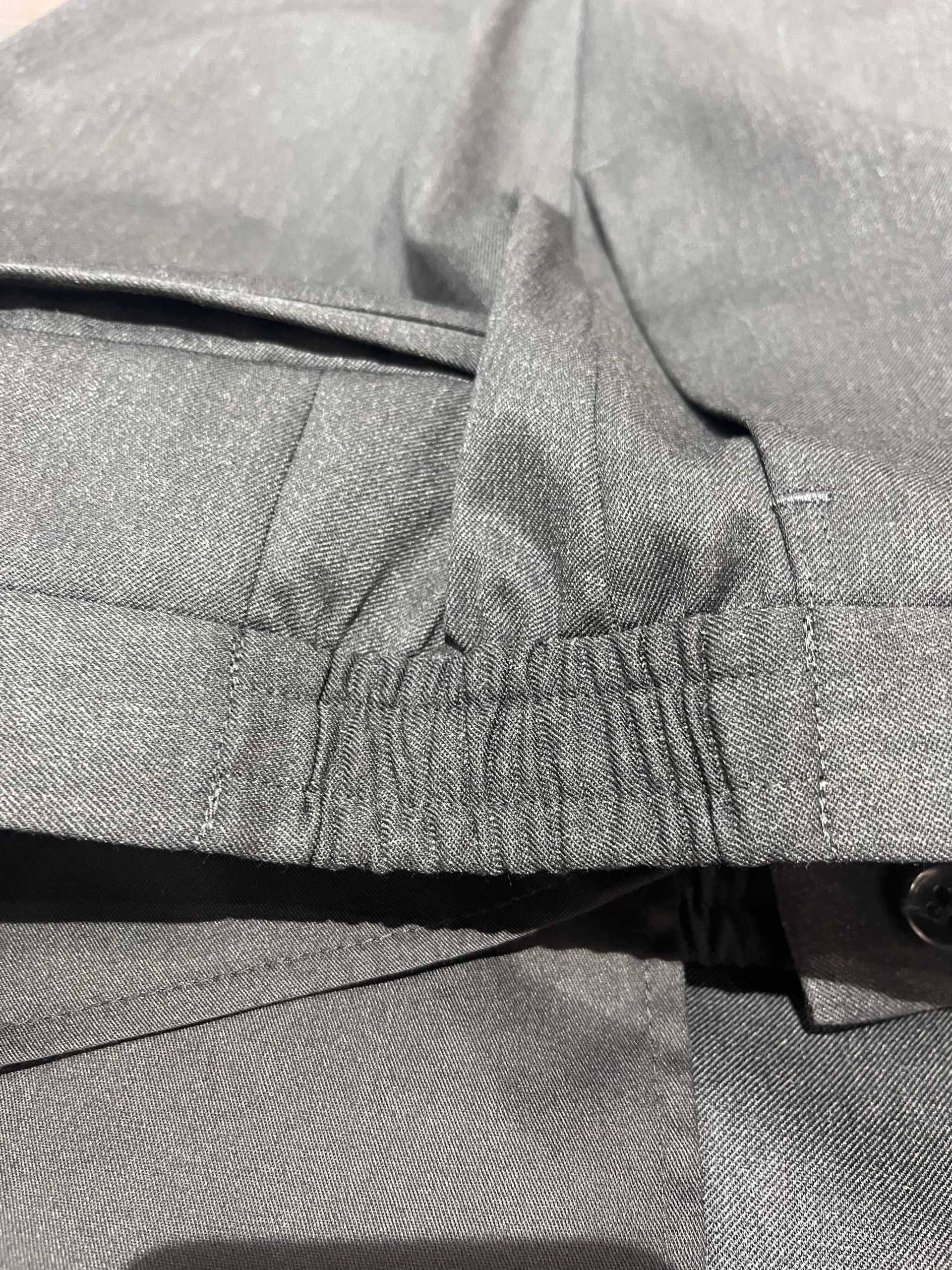 ウエスト帯にゴムが入り調節可能なスラックス。