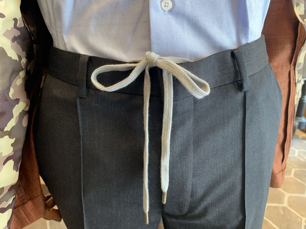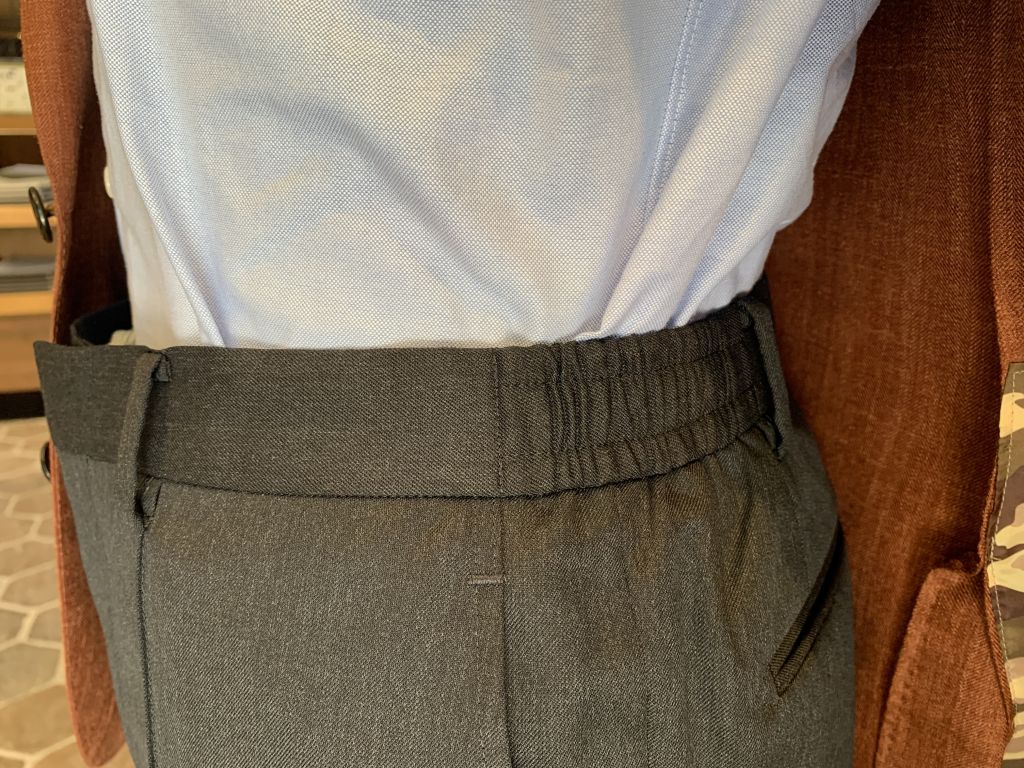 表題にもある通り、楽に履けるスラックスということで、腰に回りに紐が内蔵されたことによりウエスト回りのフィット感を調整できる画期的なアイテムを開発させて頂きました。