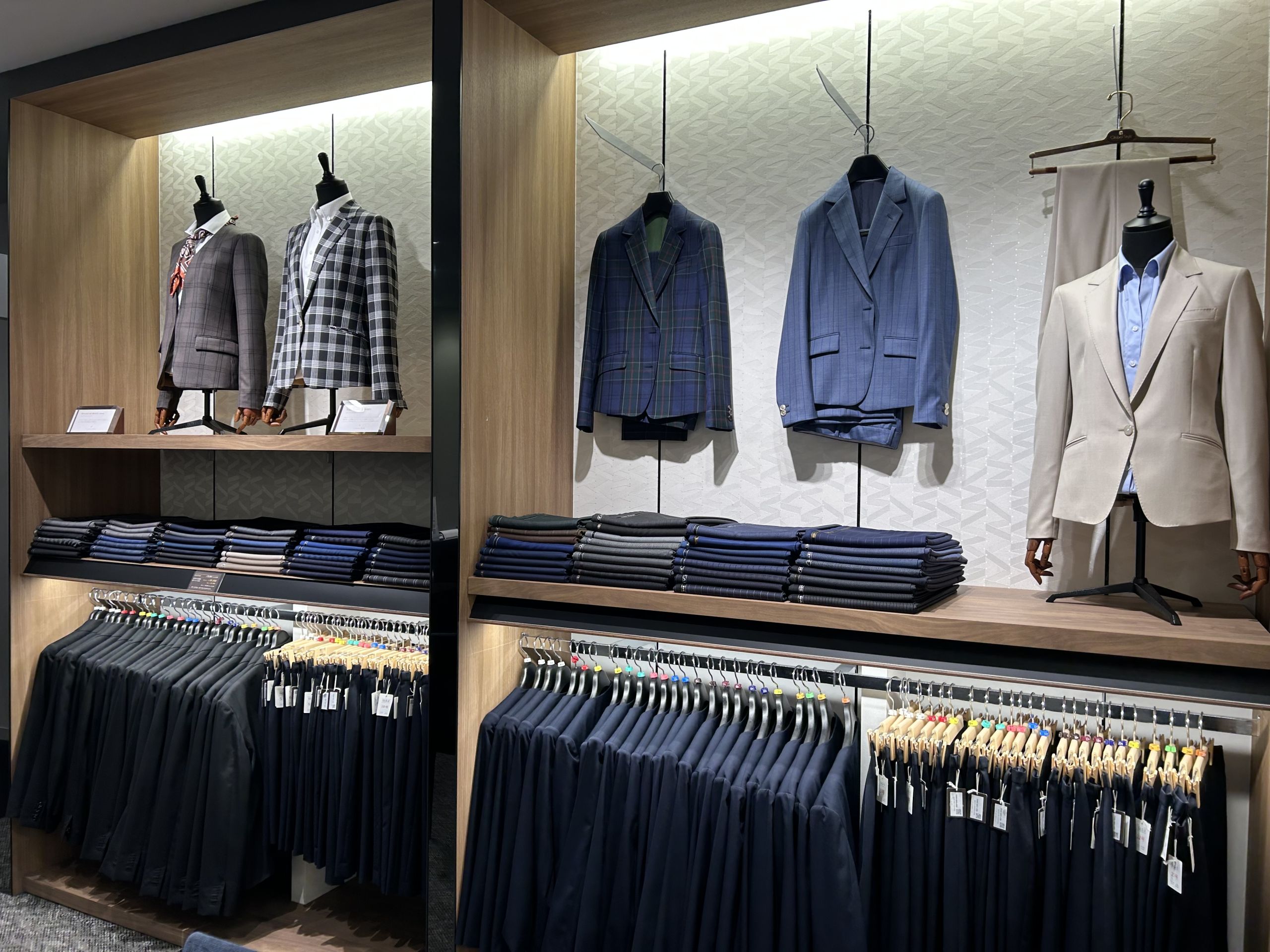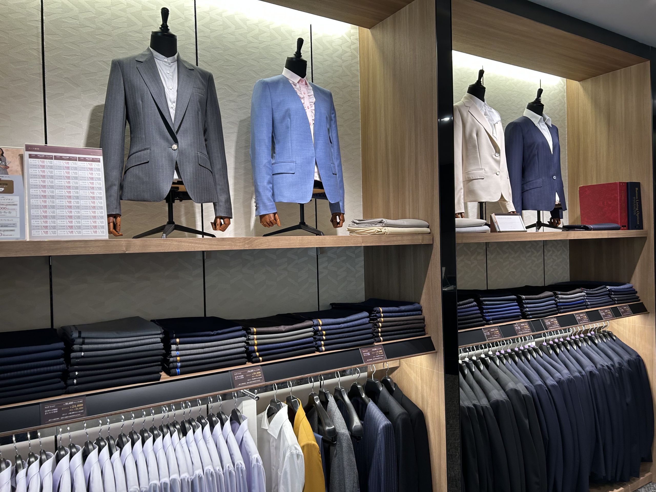 静岡呉服町店では、ウールポリエステル混紡、ストレッチ、春夏物、秋冬物で
