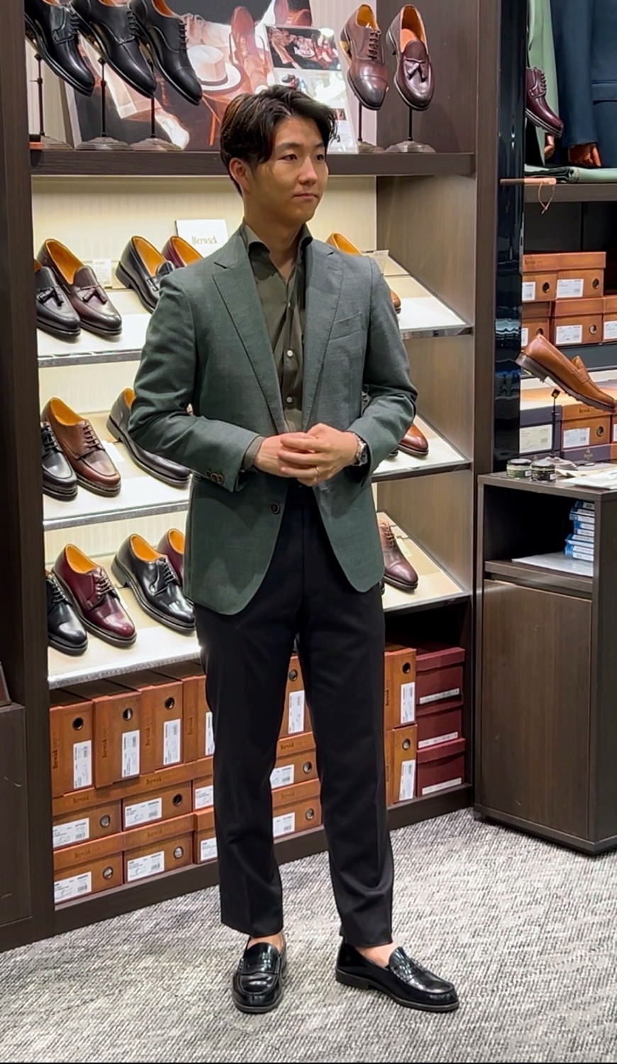 ジャケットの色が映えるように、パンツとシューズは暗めに。
