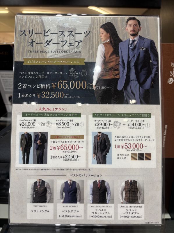 レディーススーツでもスリーピーススーツフェアも行っております。