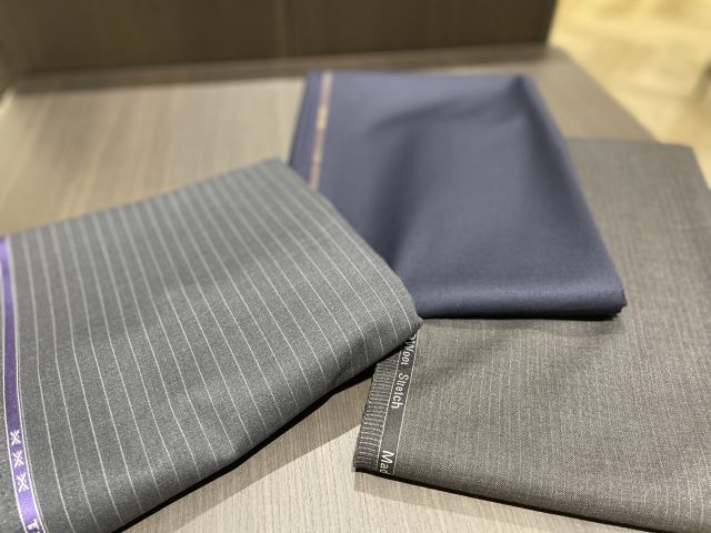 夏用生地(左のグレーストライプ)が3着コンビ価格、47,850円(税込)