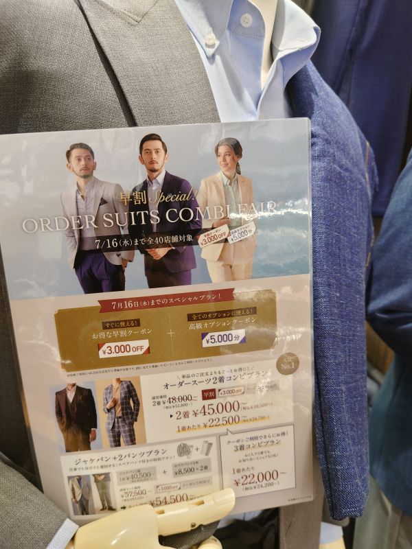 オーダースーツを2着以上お仕立て頂きますと、本体価格より¥3,000お値引き!