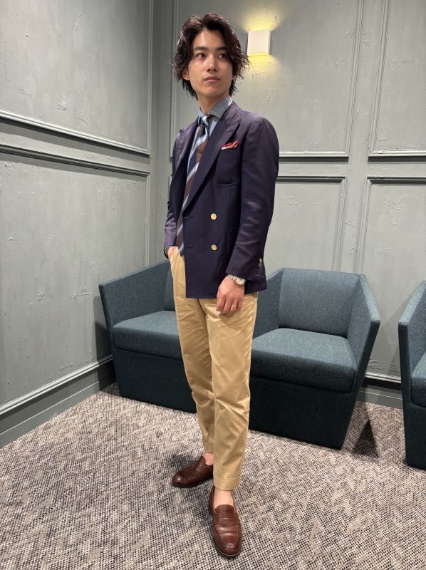 トラッドの基本を押さえつつも、シャツやローファーでカジュアルダウン。