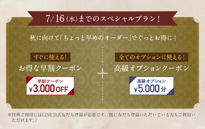 『3,000円OFF』の早割クーポンと『5,000円分』の高級オプションクーポンご利用で、