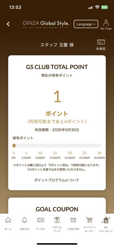 まずグローバルスタイルにはご購入金額の税抜き1万円ごとに1ポイント付与されるシステムがございます。