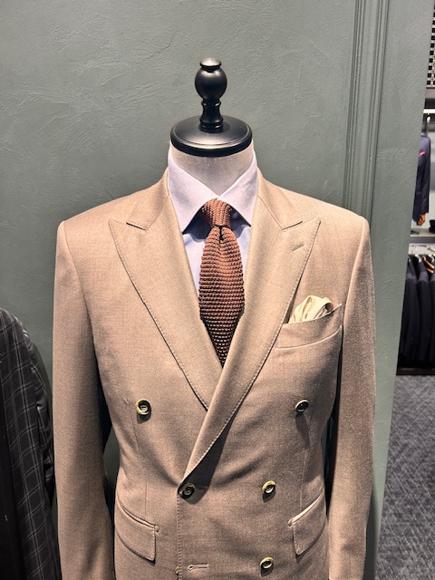 続いて、ベージュのダブルジャケットにブラウンのニットタイ
