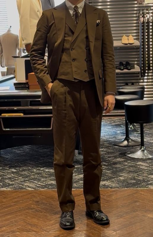 最近人気のブラウンカラーでトレンドを押さえつつ、襟付きダブルベストで