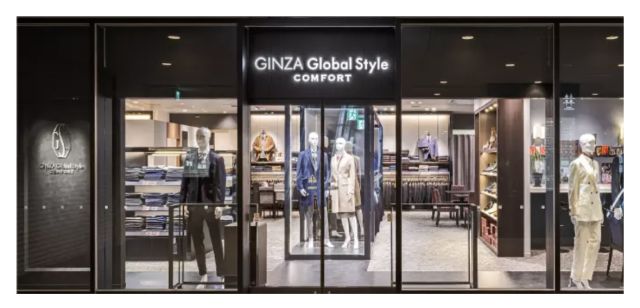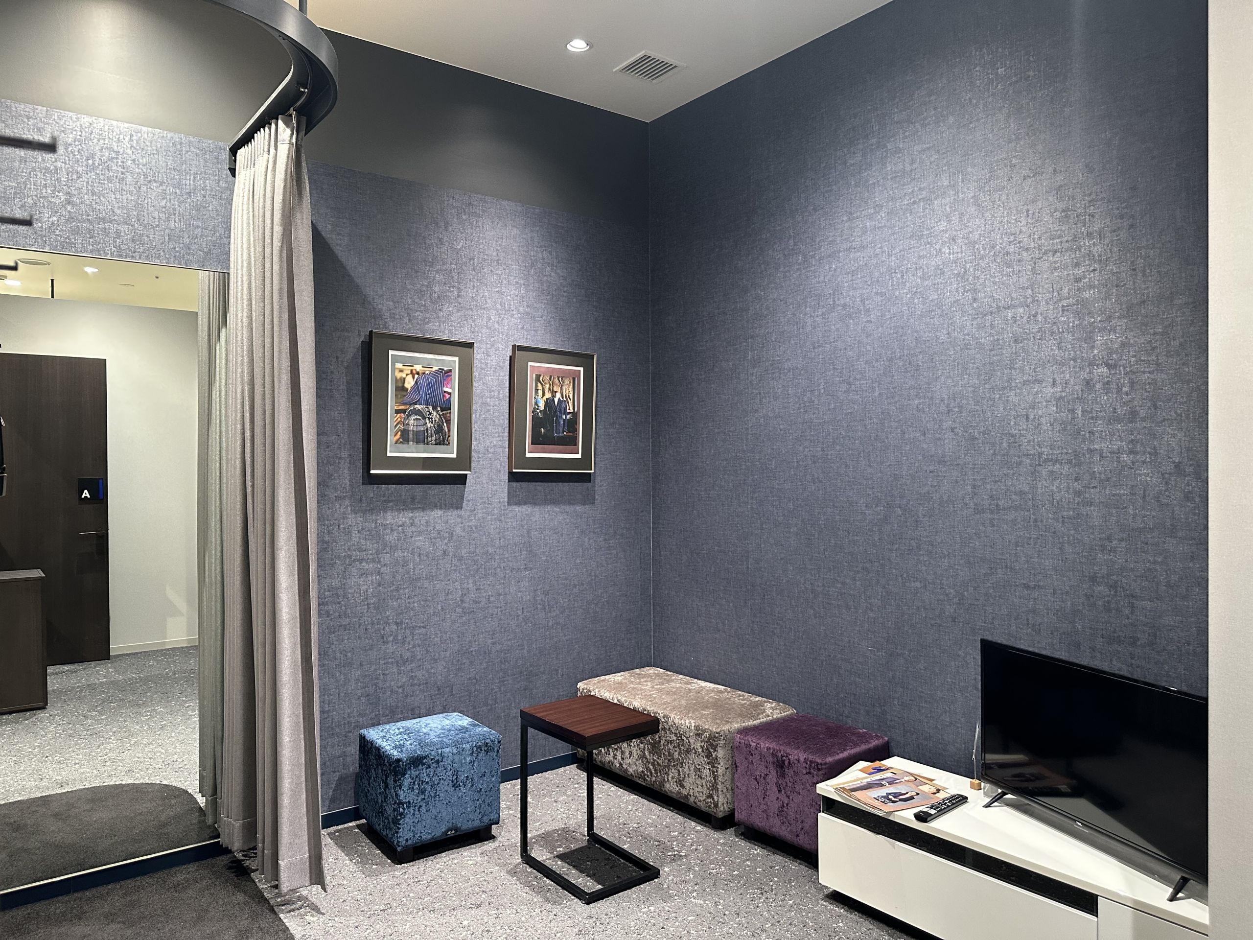 通路にゆとりがあるので、ベビーカーでのご来店も安心。ご家族でのスーツ選びや、小さなお子様連れのお客様にも、ゆったりとオーダーを楽しんでいただける空間となっています。