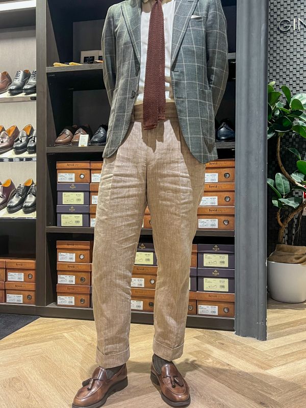 流行りのグリーンのジャケットにベージュのパンツ。ネクタイとローファーの色味によって全体にまとまりがでています。