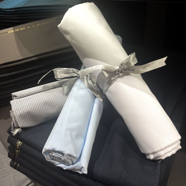 サックスストライプのシャツも涼しげな感じ。スカーフもネクタイとも違う雰囲気がでて素敵ですね( ^)o(^ )