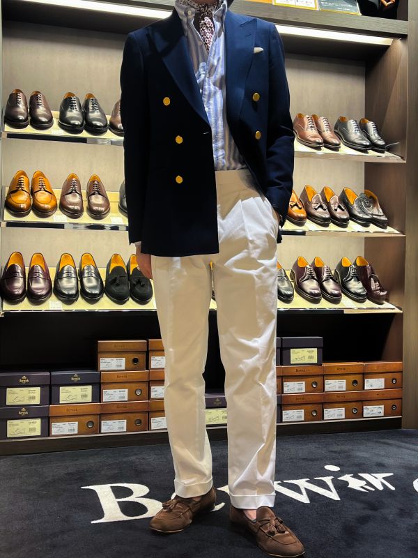 定番の紺ブレと白のパンツでメリハリのあるコーディネート。これだけでも夏っぽさが出ますね♪