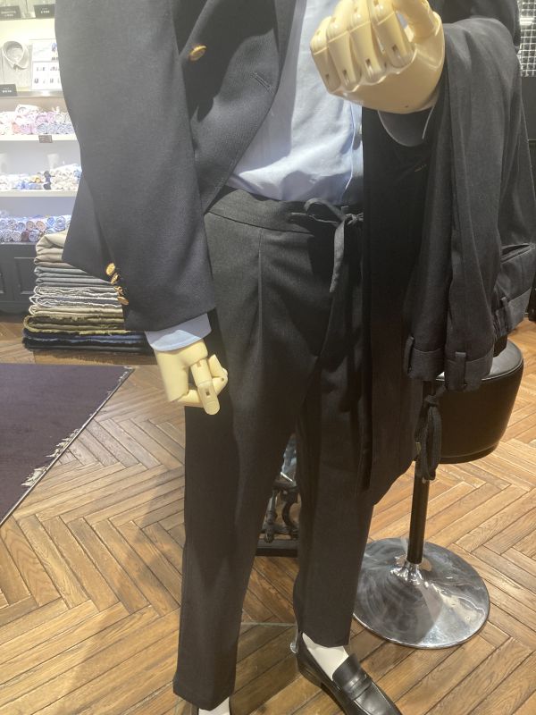 お次が、こちらは今月の新作アイテムでイージーパンツとなりましてこちらも従来のスラックスと変わり紐が付いたり、