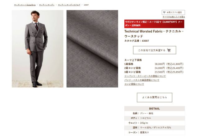 グローバルスタイルでは、オーダースーツを2着同時にご注文頂けますと、