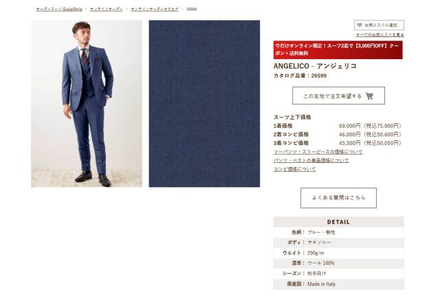 1着は当社最安値の生地+2着目はイタリア製の良い生地という、