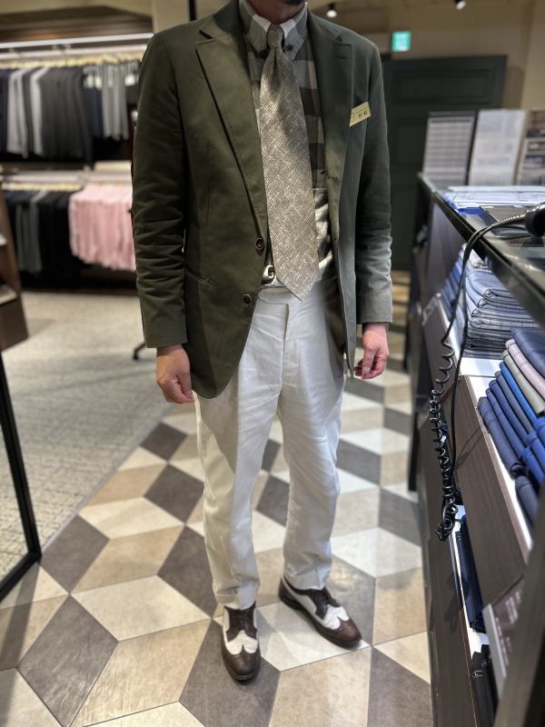 コードレーンのオフホワイトのPTにグリーンのコットンJKをチョイス。大人カジュアルです。50代のスタッフですがすごくオシャレですよね。