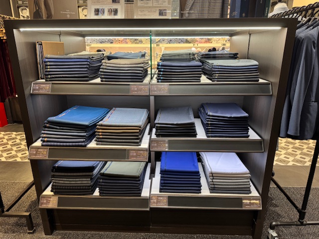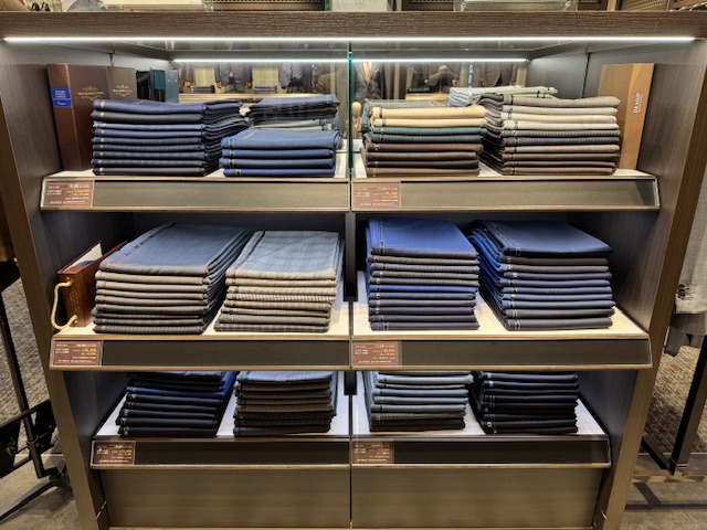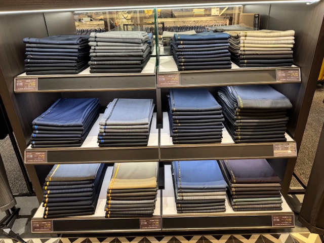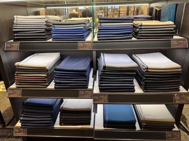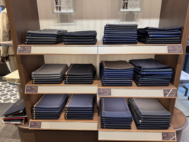 スーツの生地はこのようにたくさんありますので、店頭の鏡などを使って体に当ててみてください。