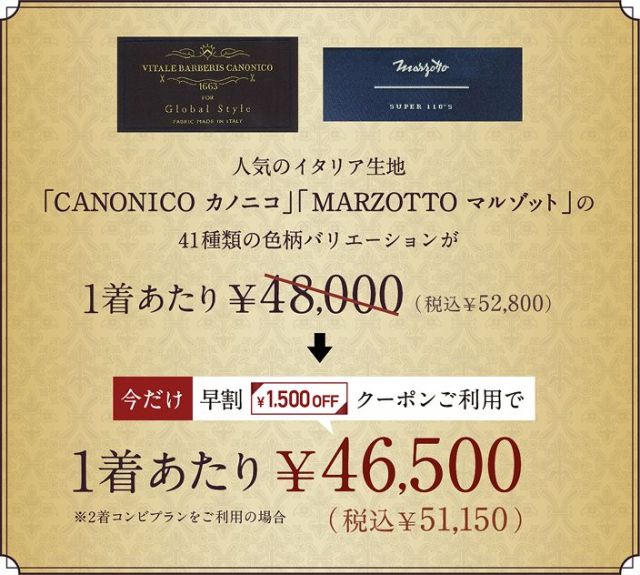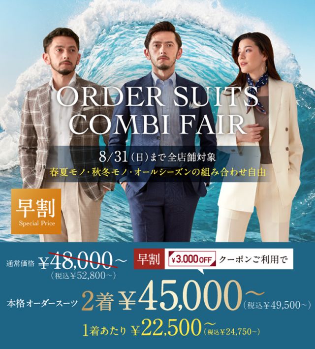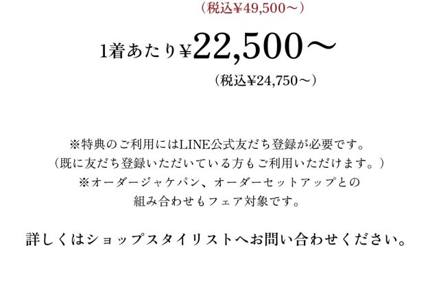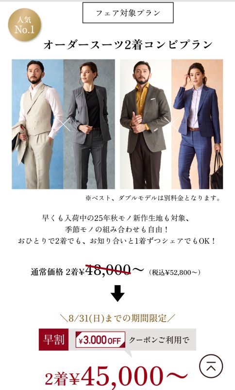 先月と同様、複数着おまとめで1着あたり1,500円、合計3,000円オフでご購入頂けます(2着コンビプランをご利用の場合)。