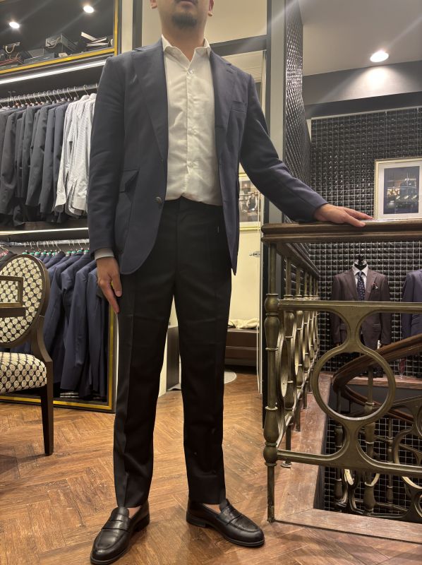 参考までに、ダークネイビーのジャケットにダークグレーのスラックスを履いてみました。