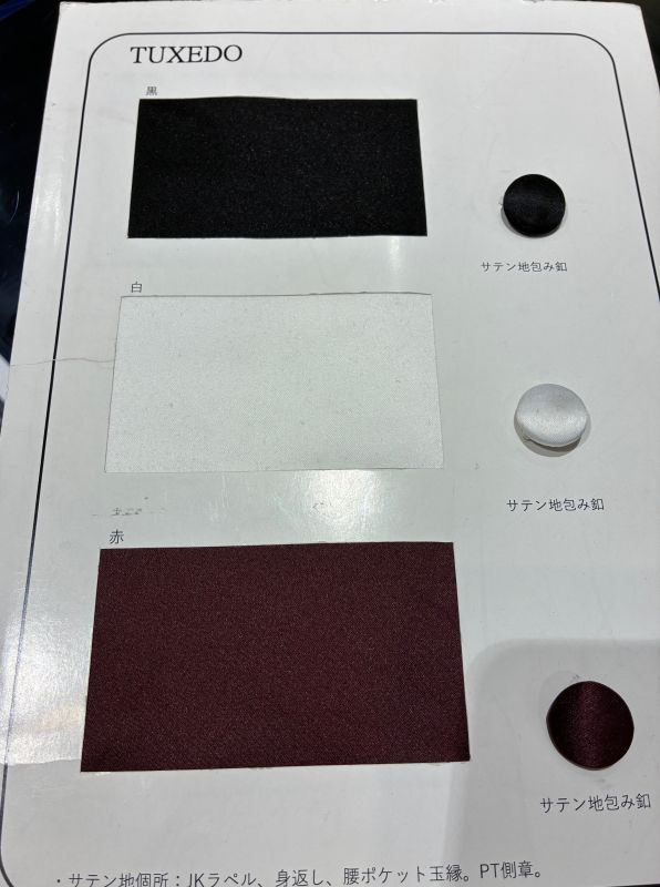 勿論、ブラック以外でも生地をお選びいただければ様々なお色味のタキシードがお仕立て出来るんです!