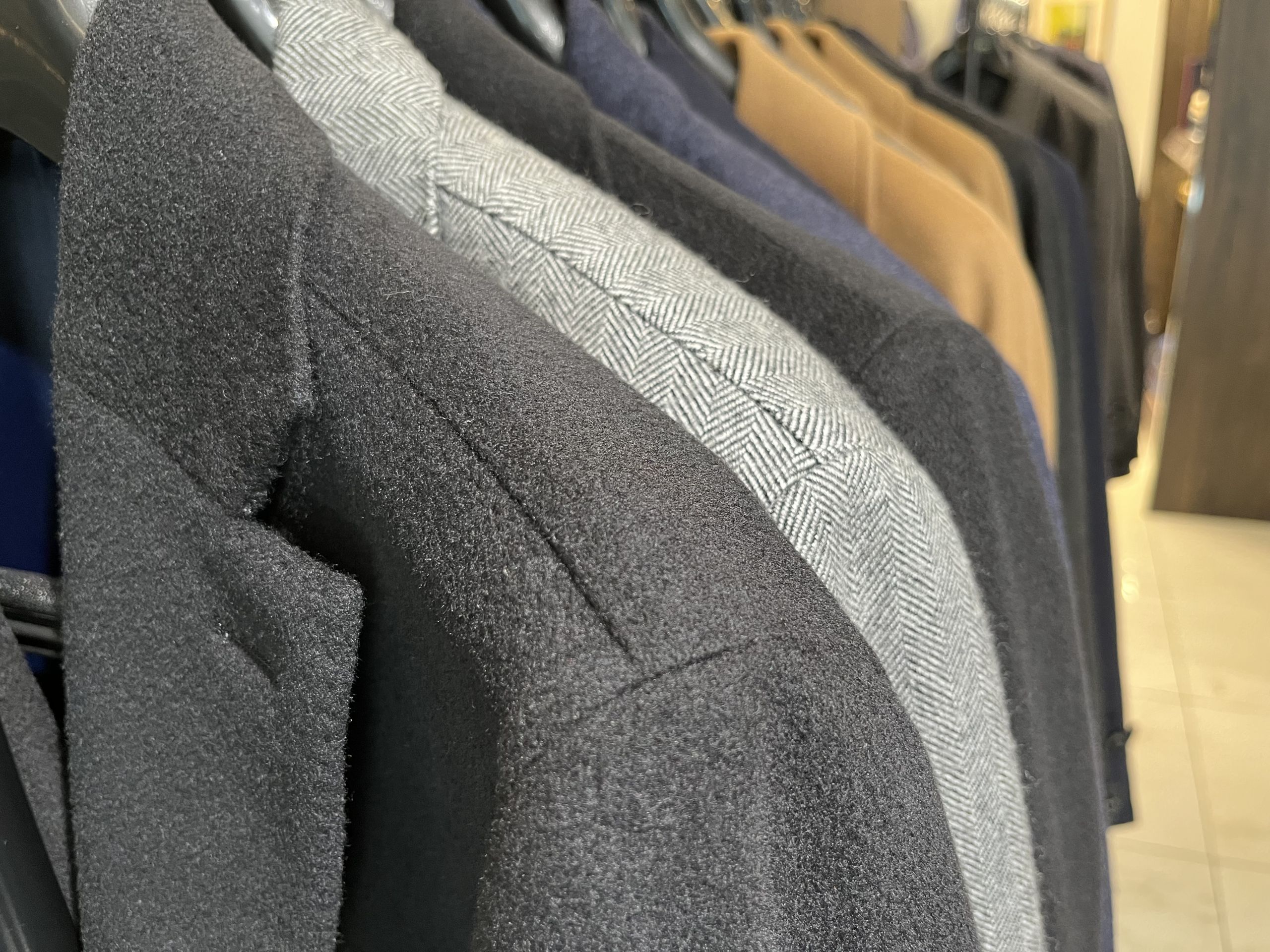 生地も定番のウールから高級ラインのカシミアなど様々な色、柄、生地をご用意しておりますので、ぜひ店頭でご覧ください!