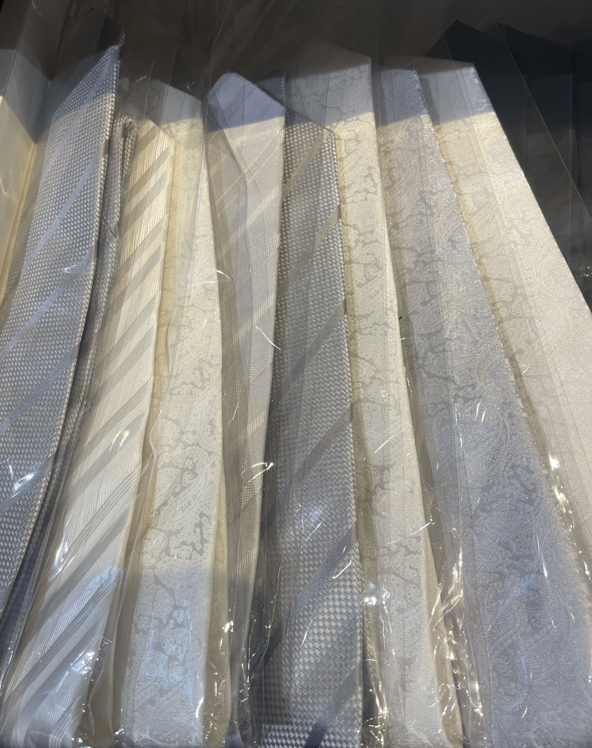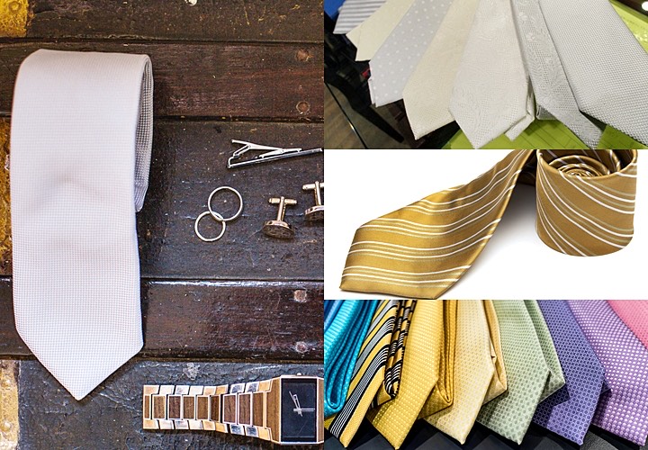 光沢のあるホワイトやシルバーの結婚式向けのネクタイを巻き、