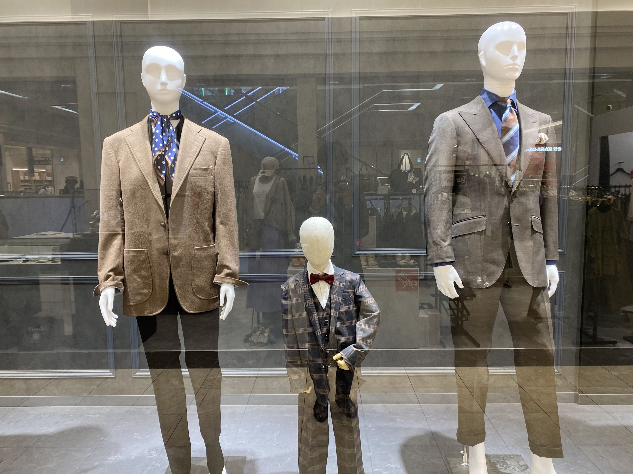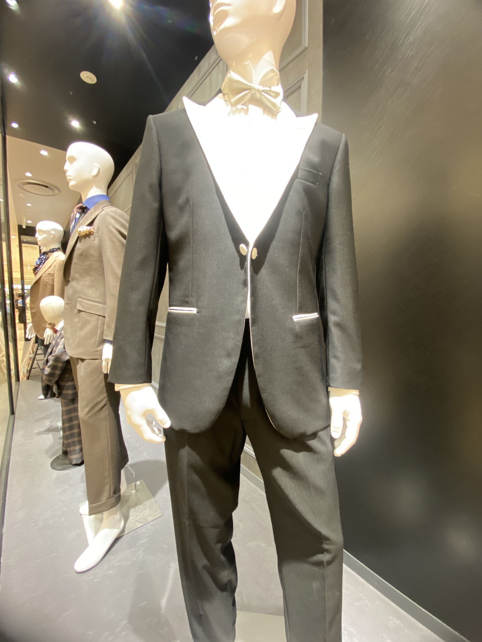 店頭は目を引きやすいタキシードと秋を感じるブラウン系のトルソーです。
