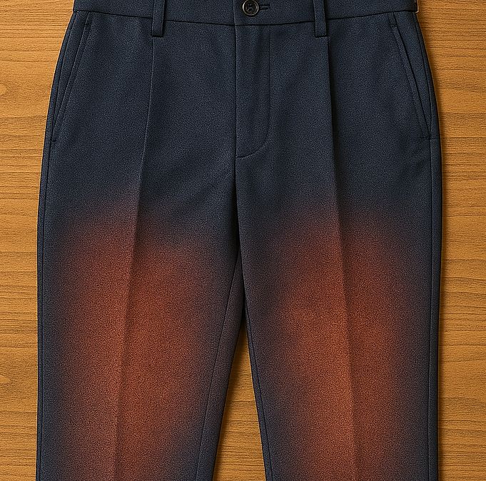 このように、汗が染み込みやすい太もも部分に、日中の紫外線が当たることで、スラックスは知らず知らずのうちに変色していくのです。