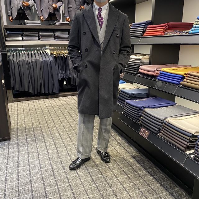今回着用したのはダブルですがもちろん通常のチェスターコートもオーダーできます