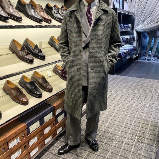 こちらはバルカラーコートでハリスツイードのグリーンチェックです