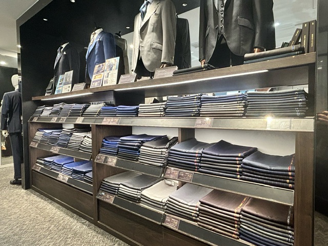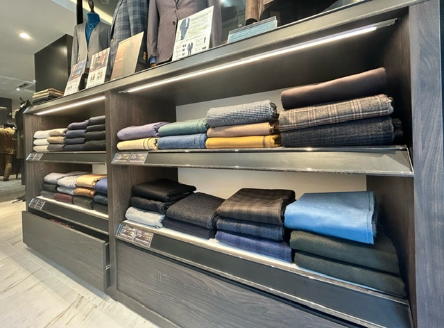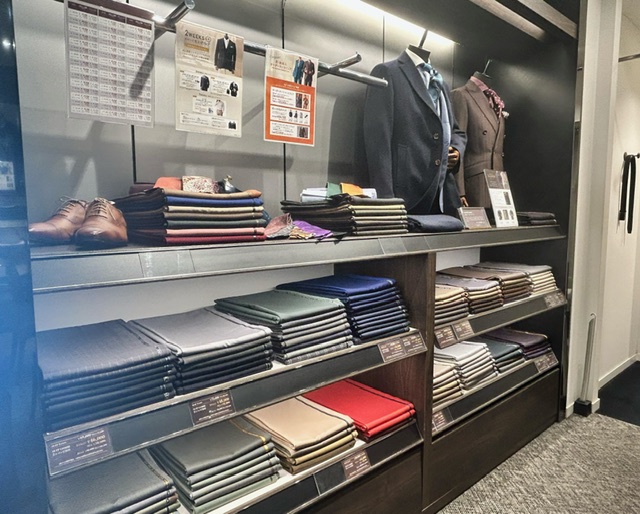 スーツ生地の近くに、シャツ生地やネクタイなども置いているので