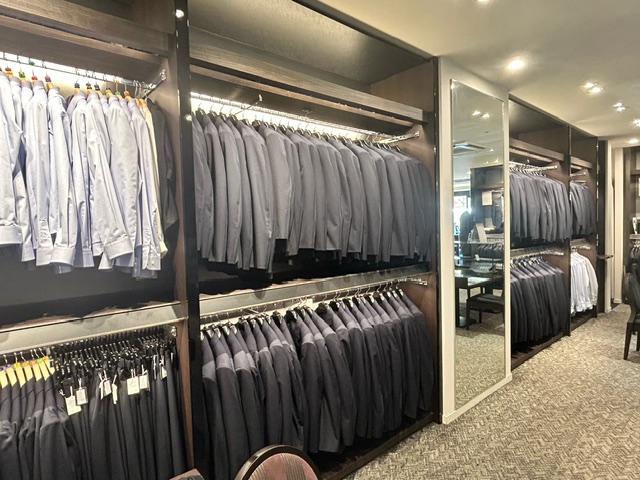 壁にかかっているのは、採寸時に着ていただくジャケットやパンツたち。