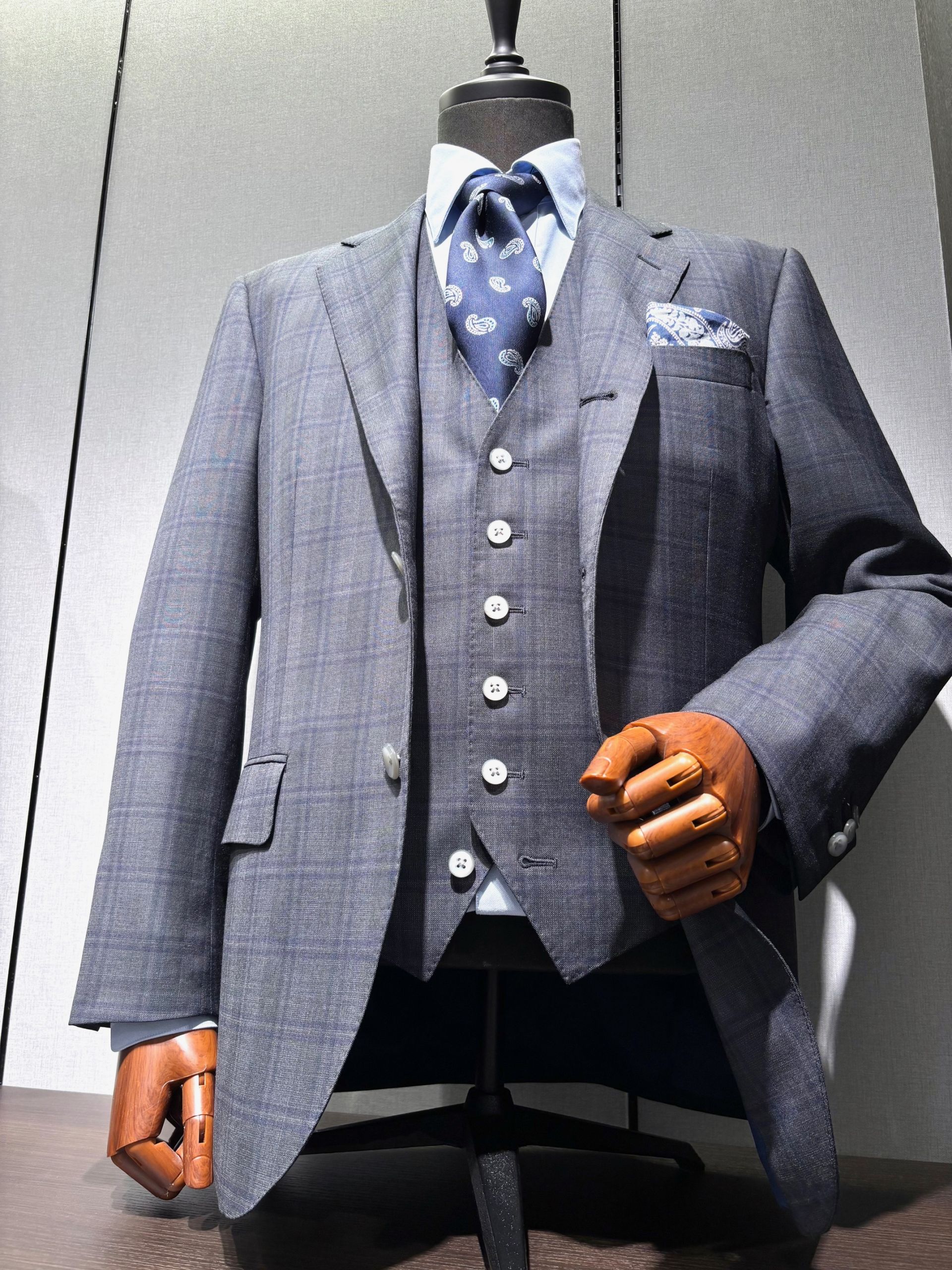 続いて、チャコールグレーのチェック柄、3Pスーツです!