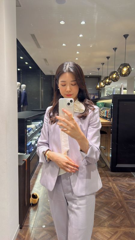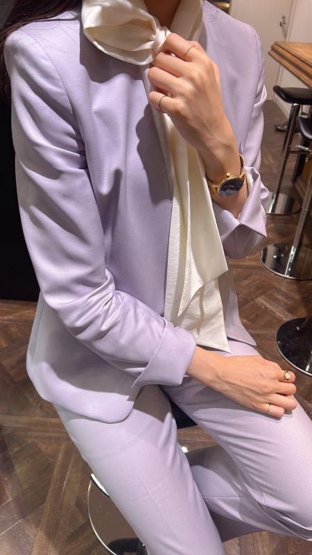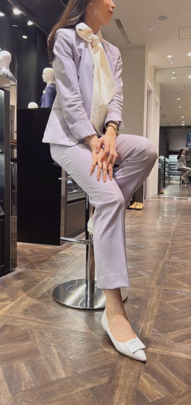 綺麗めをコンセプトにブラウスとパンプスは白で統一致し、ジャケット袖(スリット仕様)とパンツポケットの釦はなし。