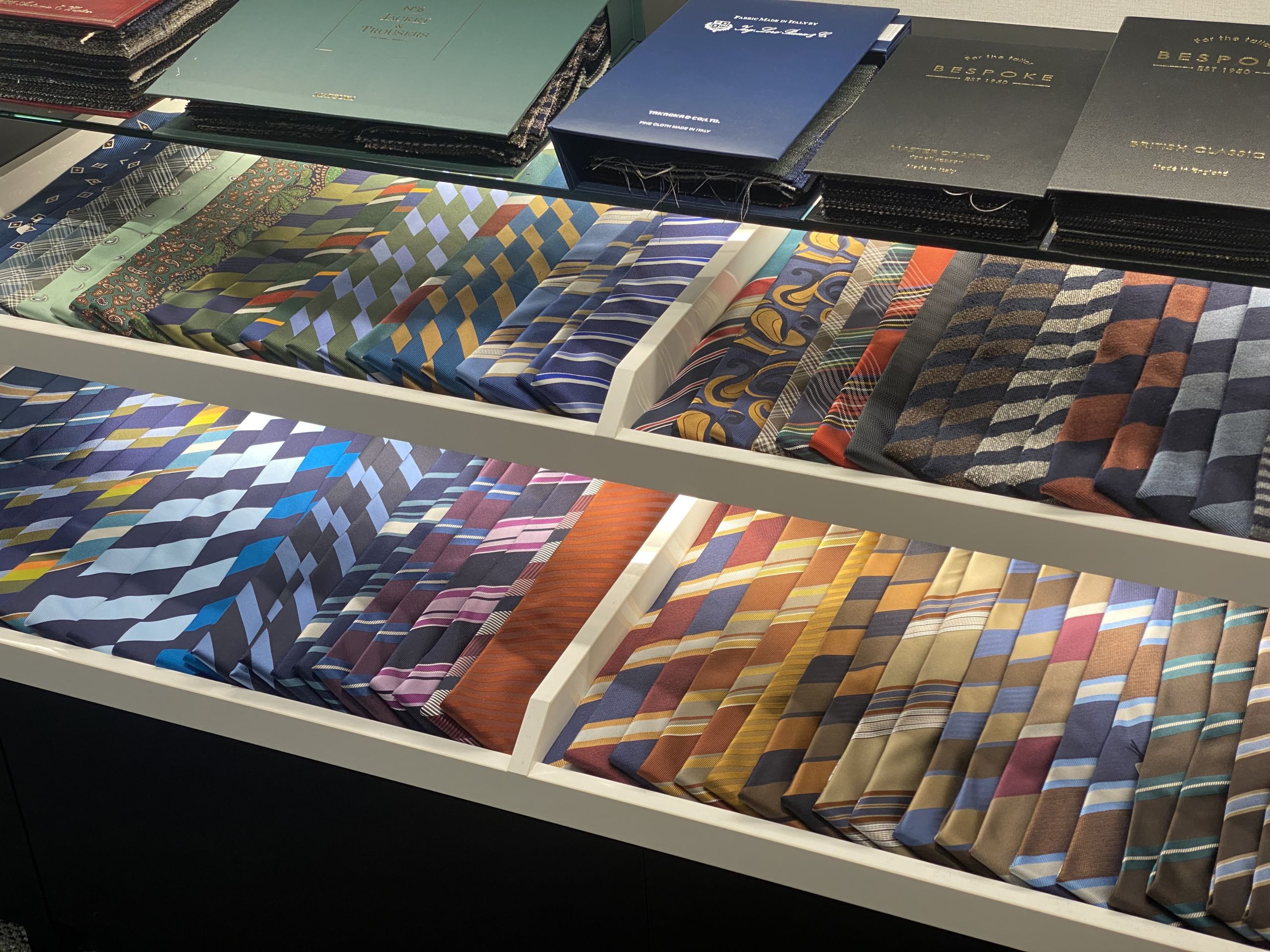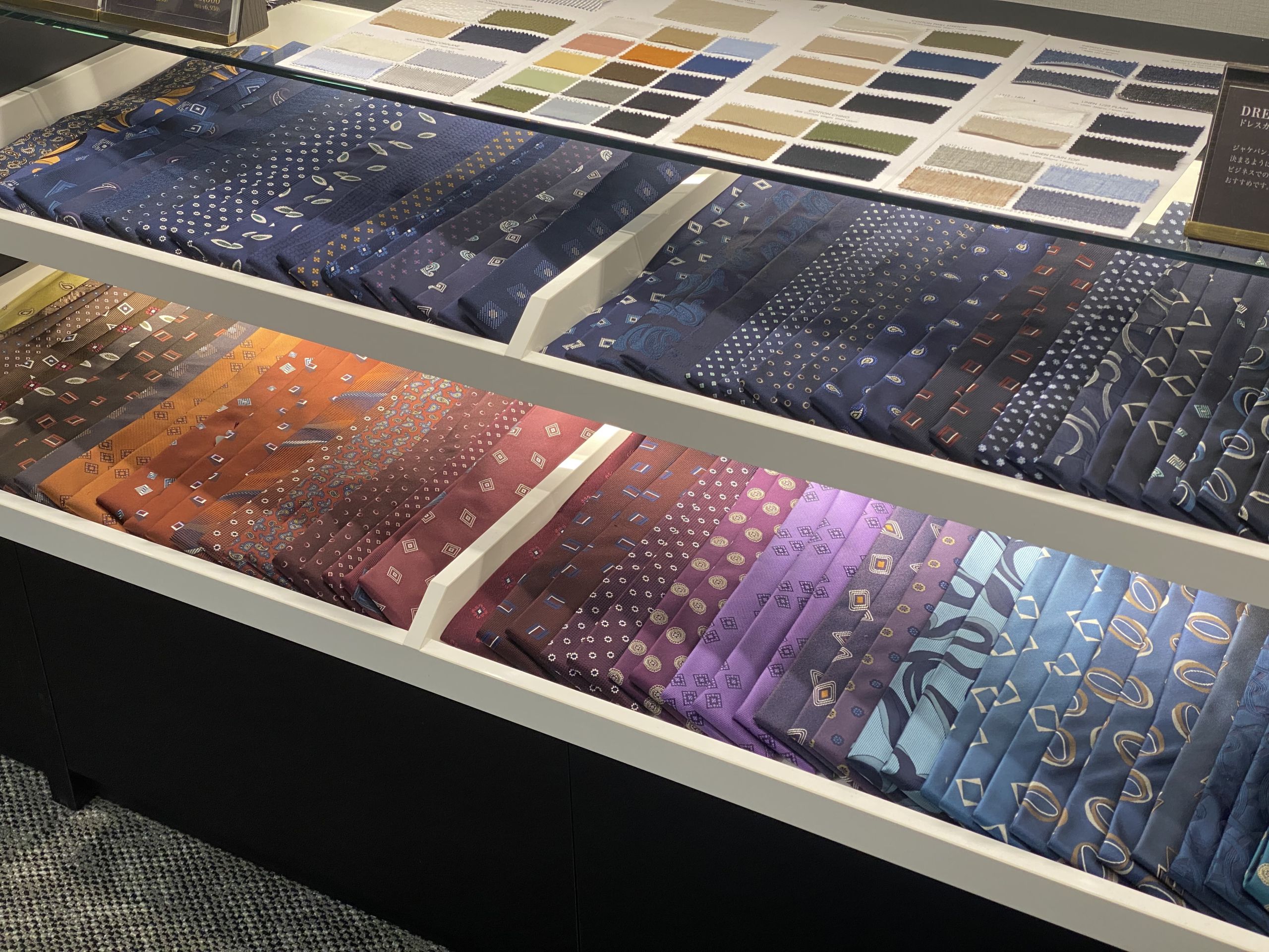 スーツ仕上がって、試着していただいて、そのままネクタイを合わせることも出来ます。