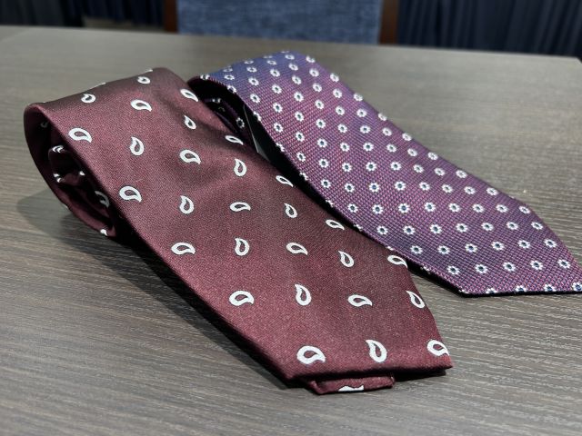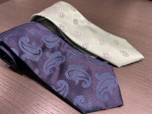 ペイズリーや細かいドット、幅の細めのレジメンタルなどは王道ですね。