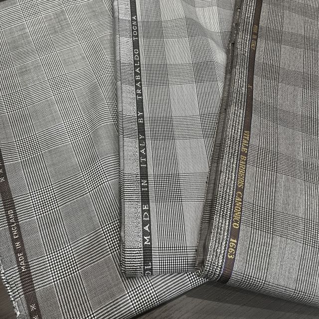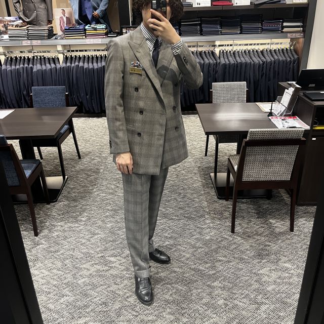 グレンチェックの生地で仕立てたスーツです