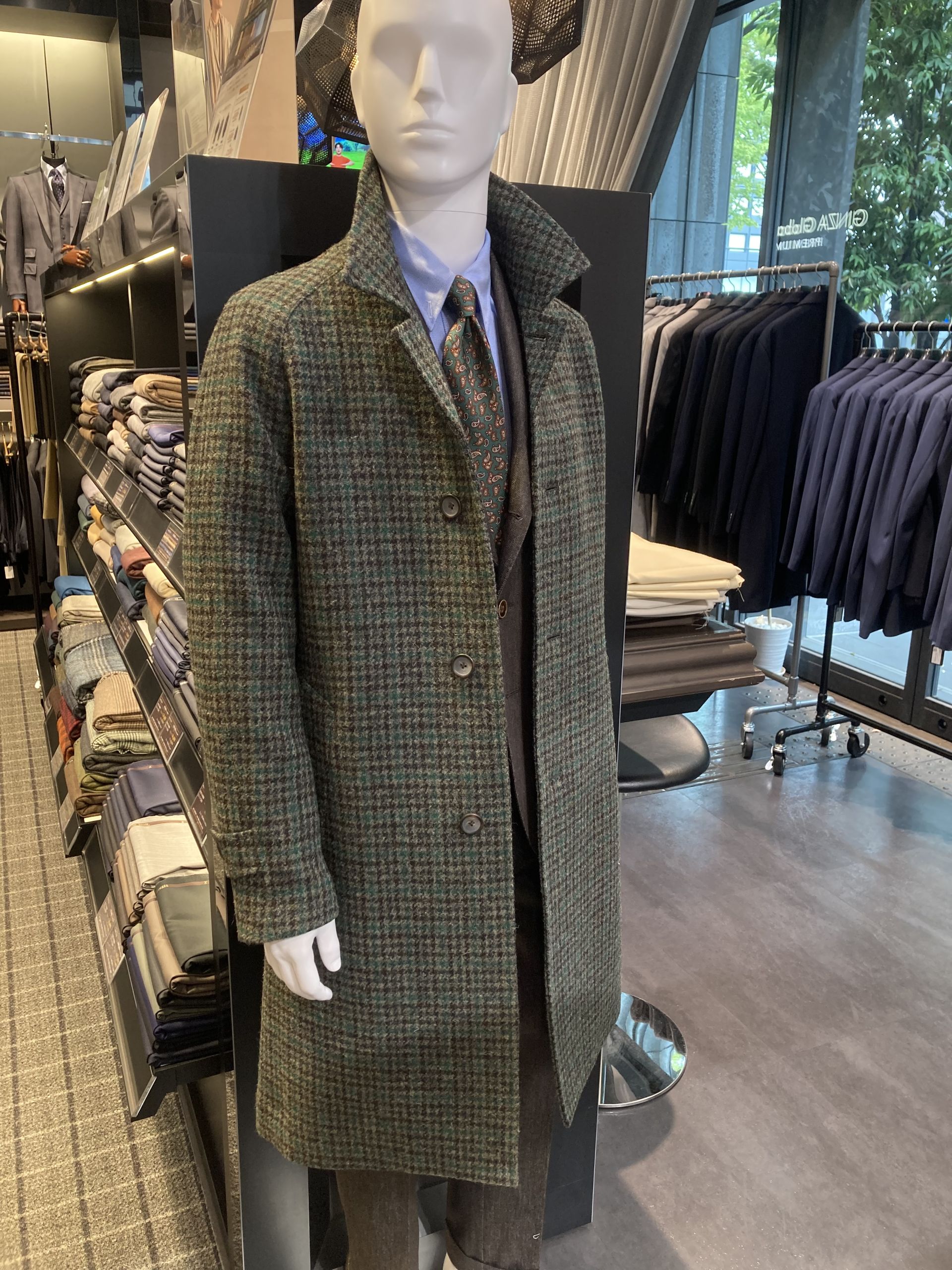入り口を入って右に曲がったところにオーダーコートのサンプルと生地がございます。