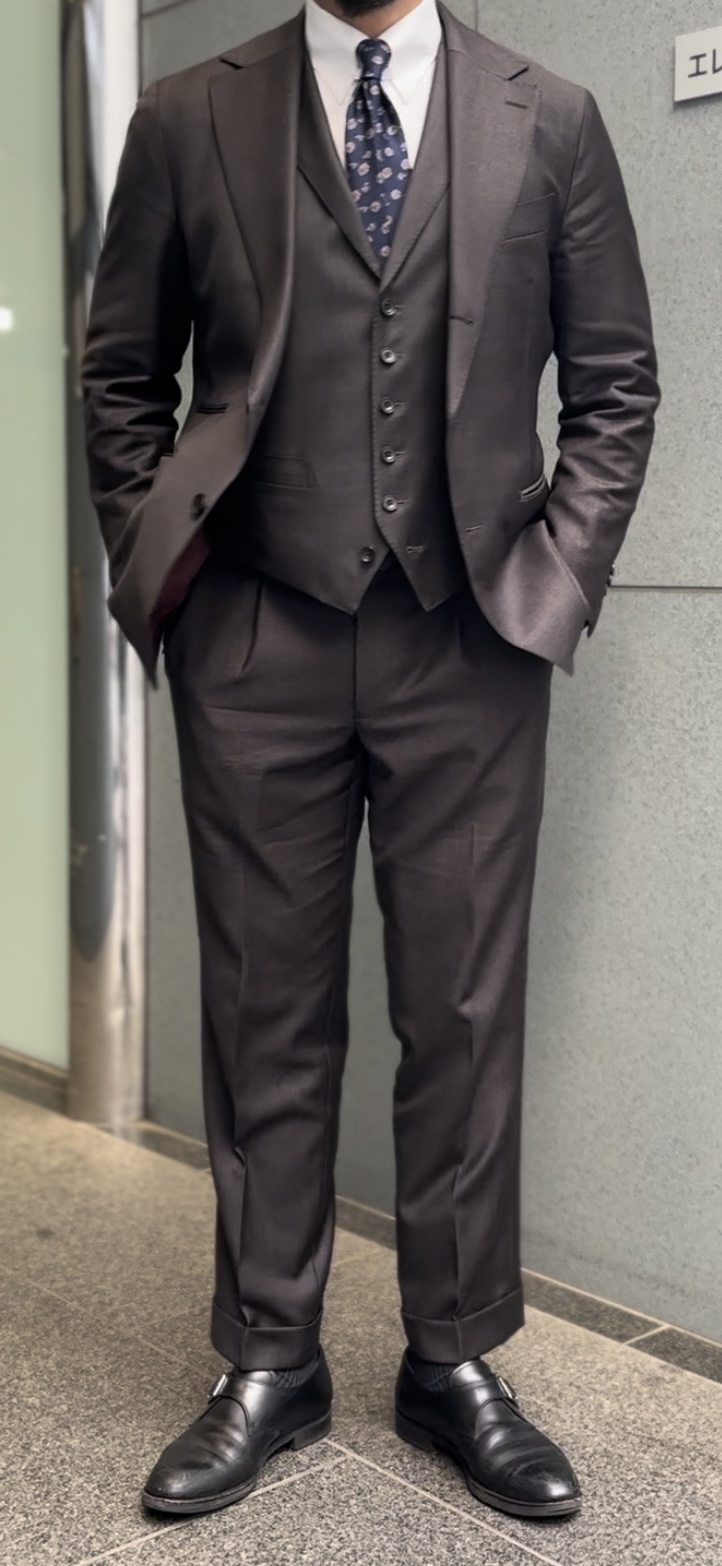 ここ最近オーダースーツは軽量化が進んでおりますが、私もアンコンモデル(肩パッドや芯地を極力排したモデル)を常に着用しており、得意とするスタイルです!