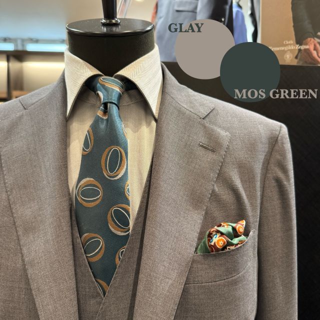 爽やかなグレーに深みのあるモスグリーンを合わせたコーディネート
