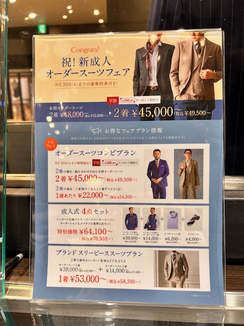 今月はスーツ2着ご購入の方になんと ¥3,000 OFF のクーポンをご利用いただけます。