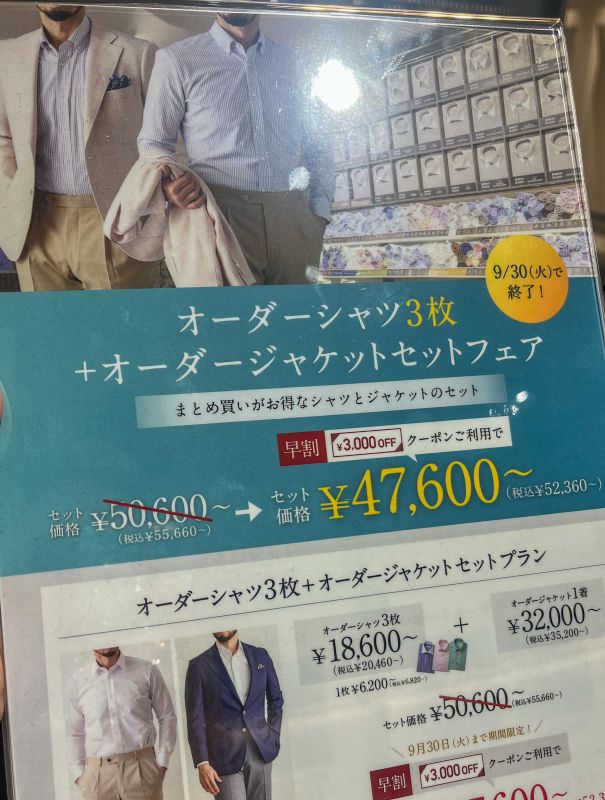 今回ブログでご案内いたしました、ジャケットとシャツ3枚でご購入いただくと合計金額から¥3,000引き!!!