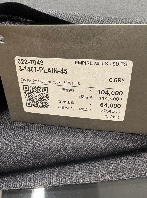 最近入荷されたばかりの新作「エンパイアミルズ」のキャバルリーツイルの生地。