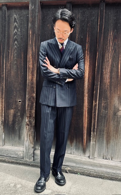 写真ではわかりにくいかもですがネイビーのチョークストライプです。