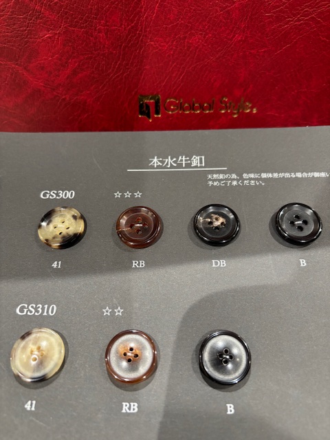 自然由来の釦、高級感の出るメタル釦などもあります。