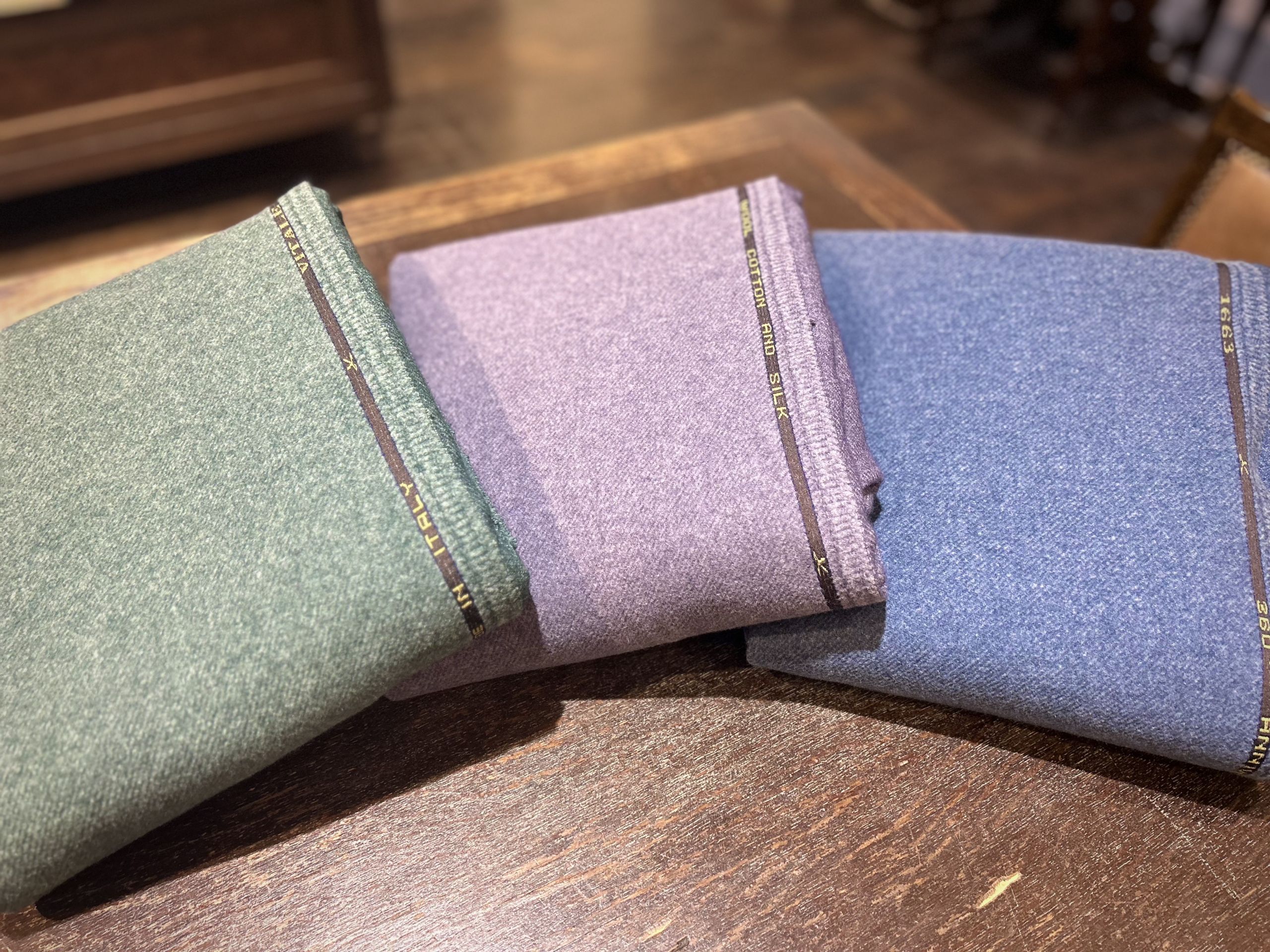 既製服にない派手目なお色味の展開もございますので私服用のコートのお仕立てができるのも魅力的てすね。