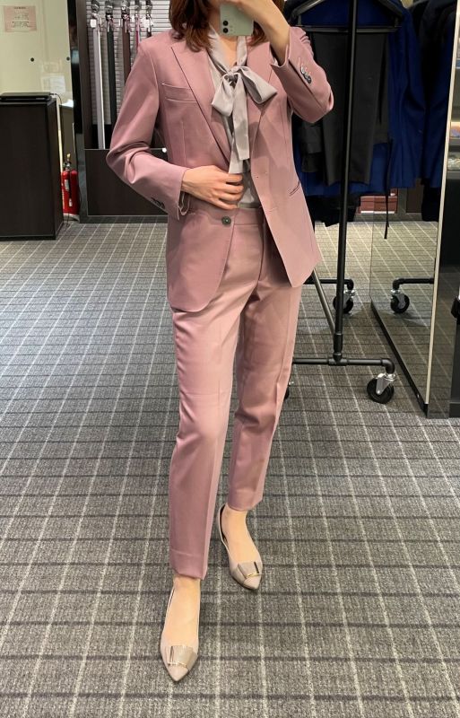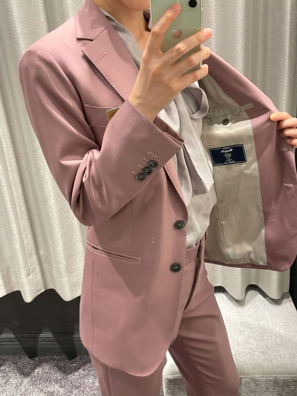 ジャケットはメンズのアンコンモデル、パンツはレディーステーパードで仕立てております。