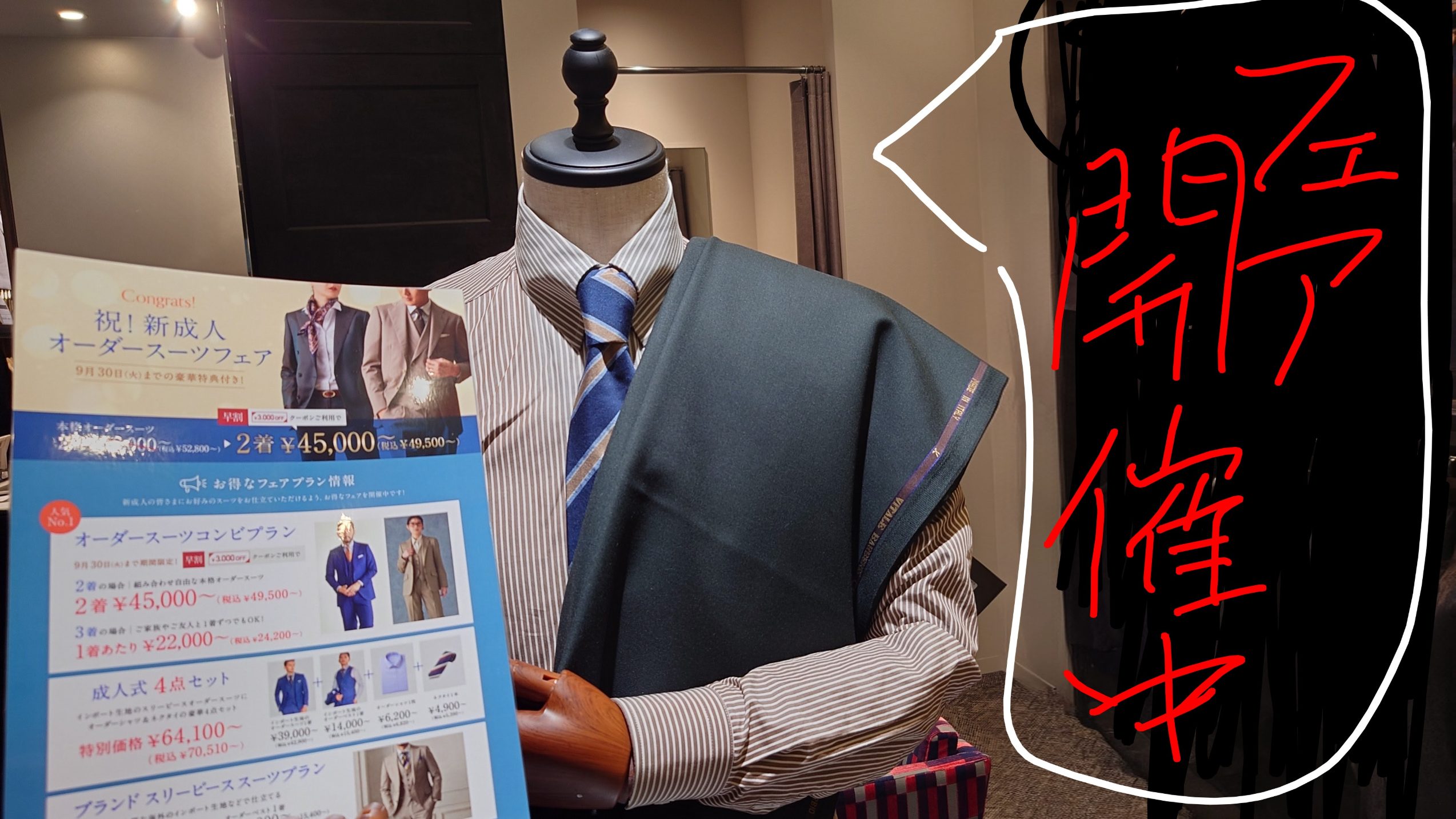 お得なフェアの紹介をしながら、マネキン君が掛けている生地は